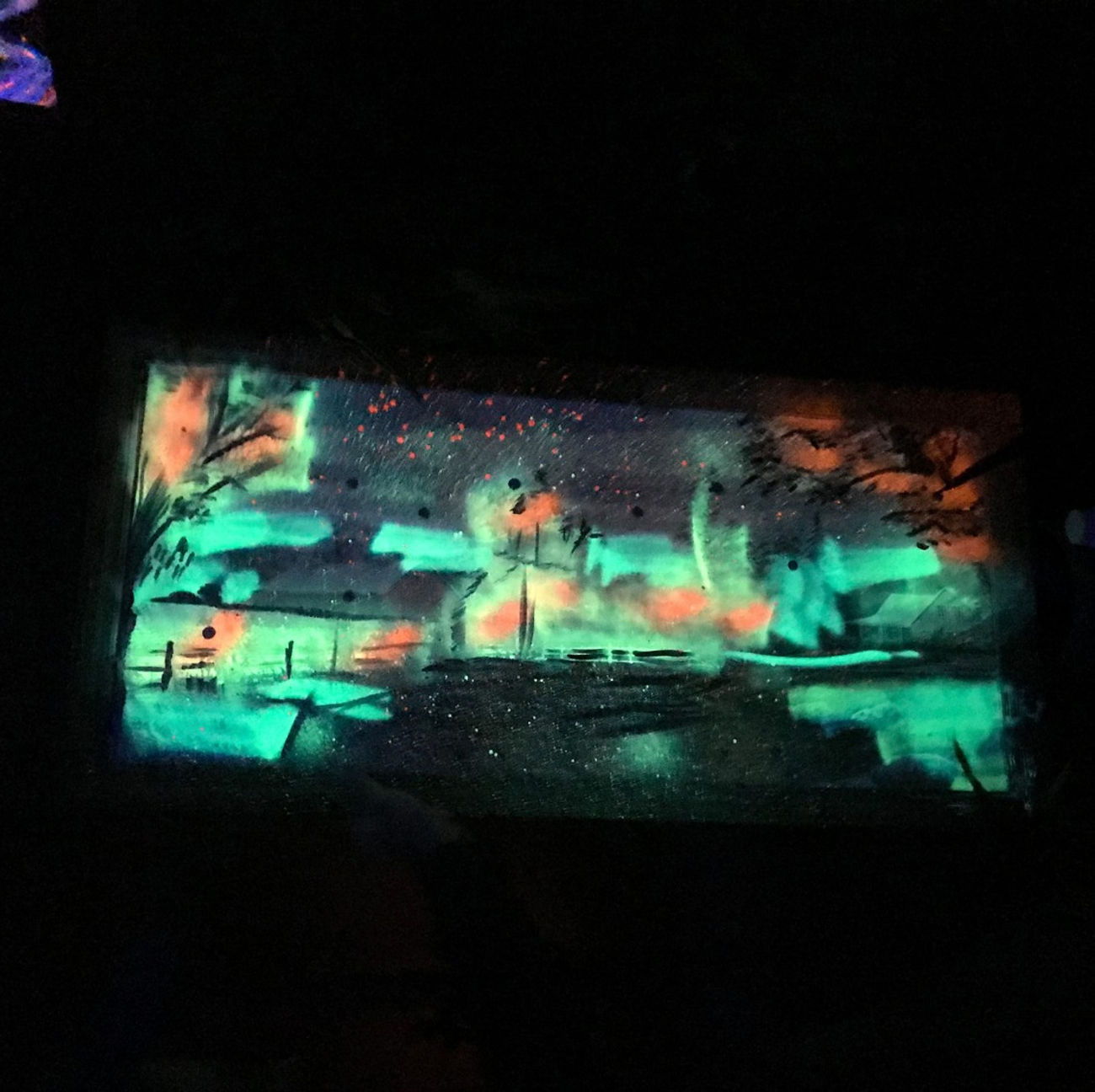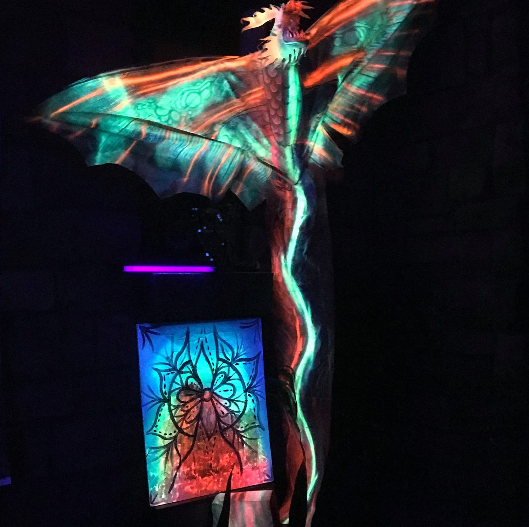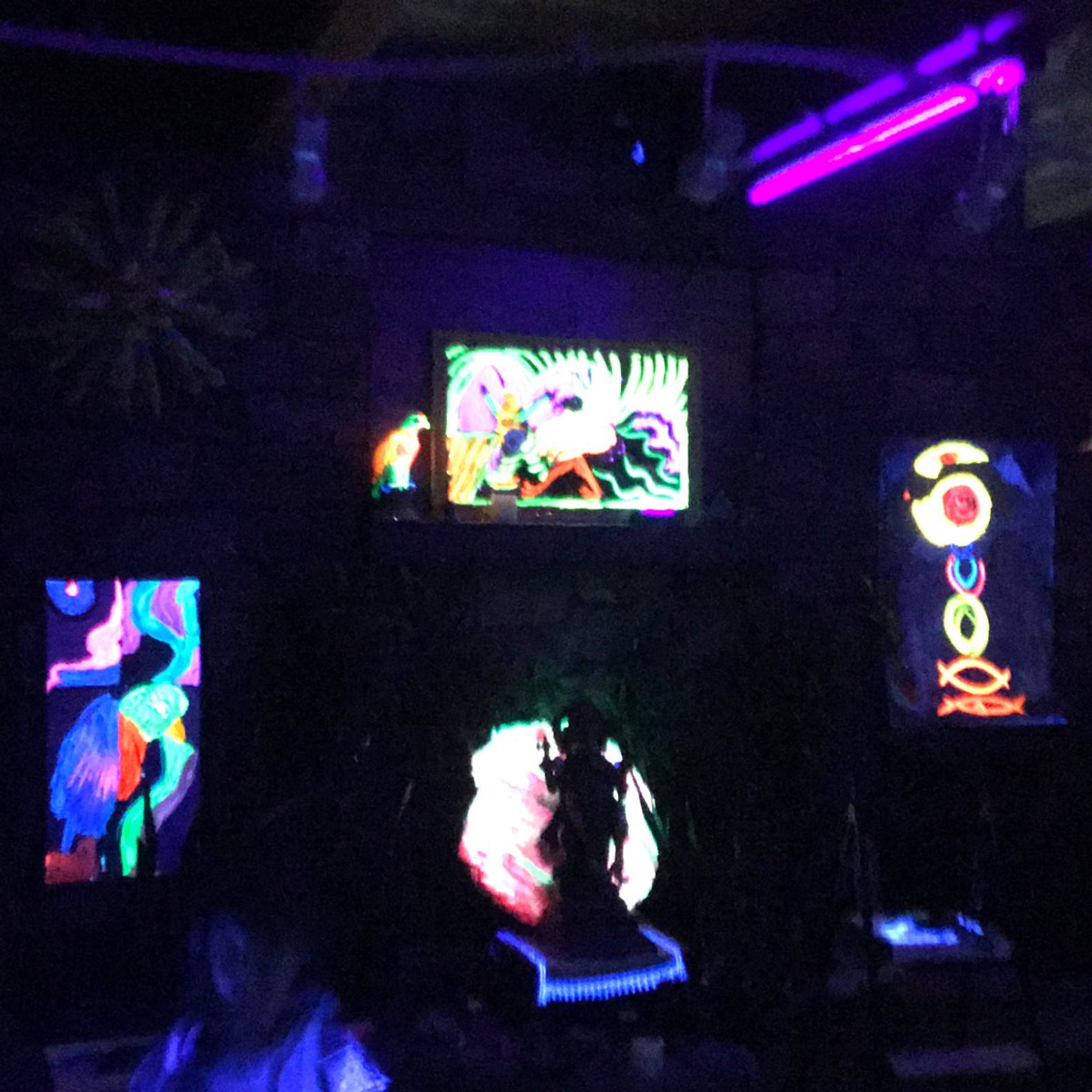 Black Light Gallery Sunwater Spa 2018 Kat has created some truly immersive experiences with her blacklight art including 2018’s Black Light Galler at SunWater Spa in 2018. Black light landscape painting. The Black Light Gallery hanging up at Sunwater Spa during Kat's Aquanox event. Black light Dragon Kite & Mandala painting.