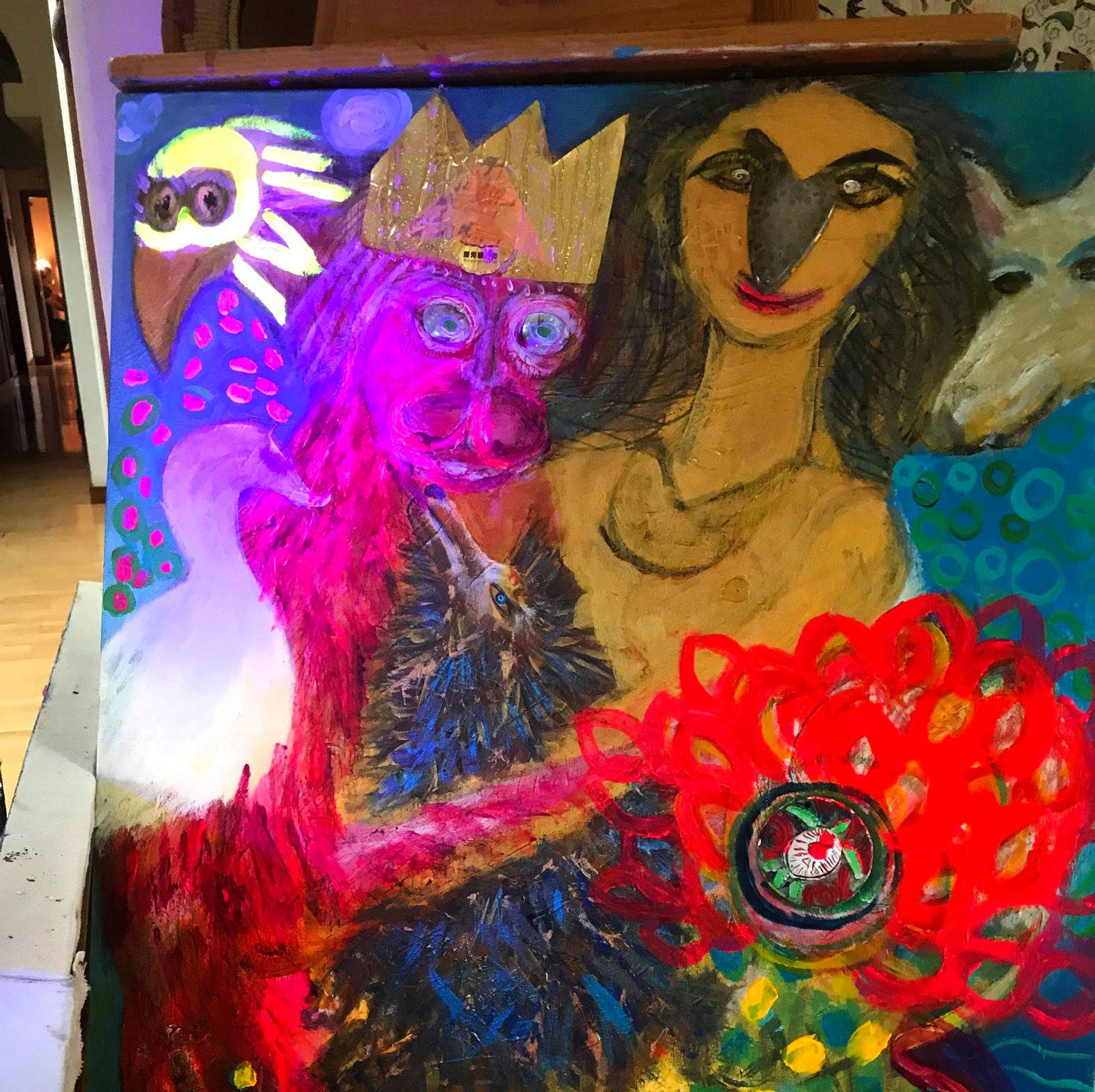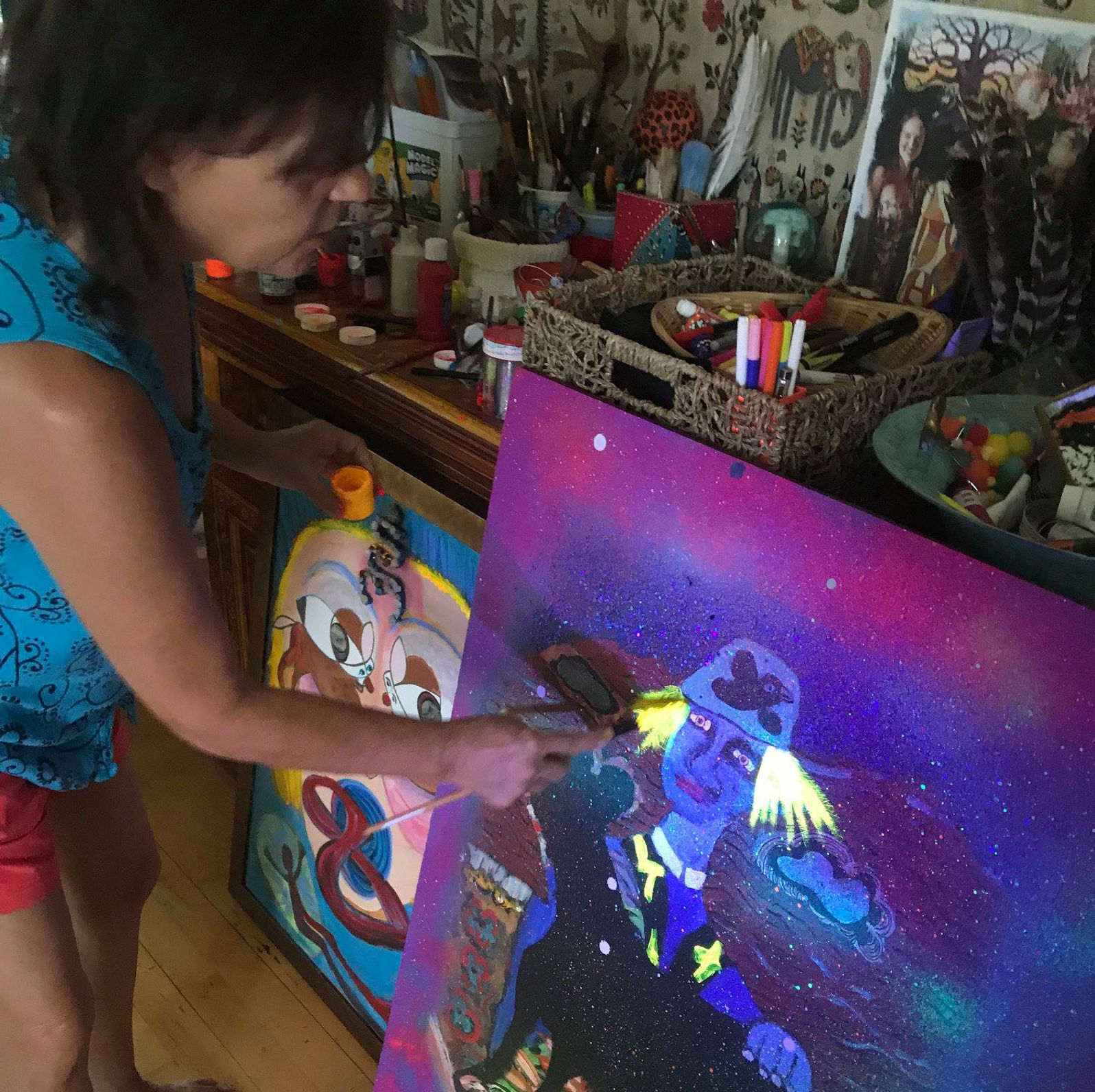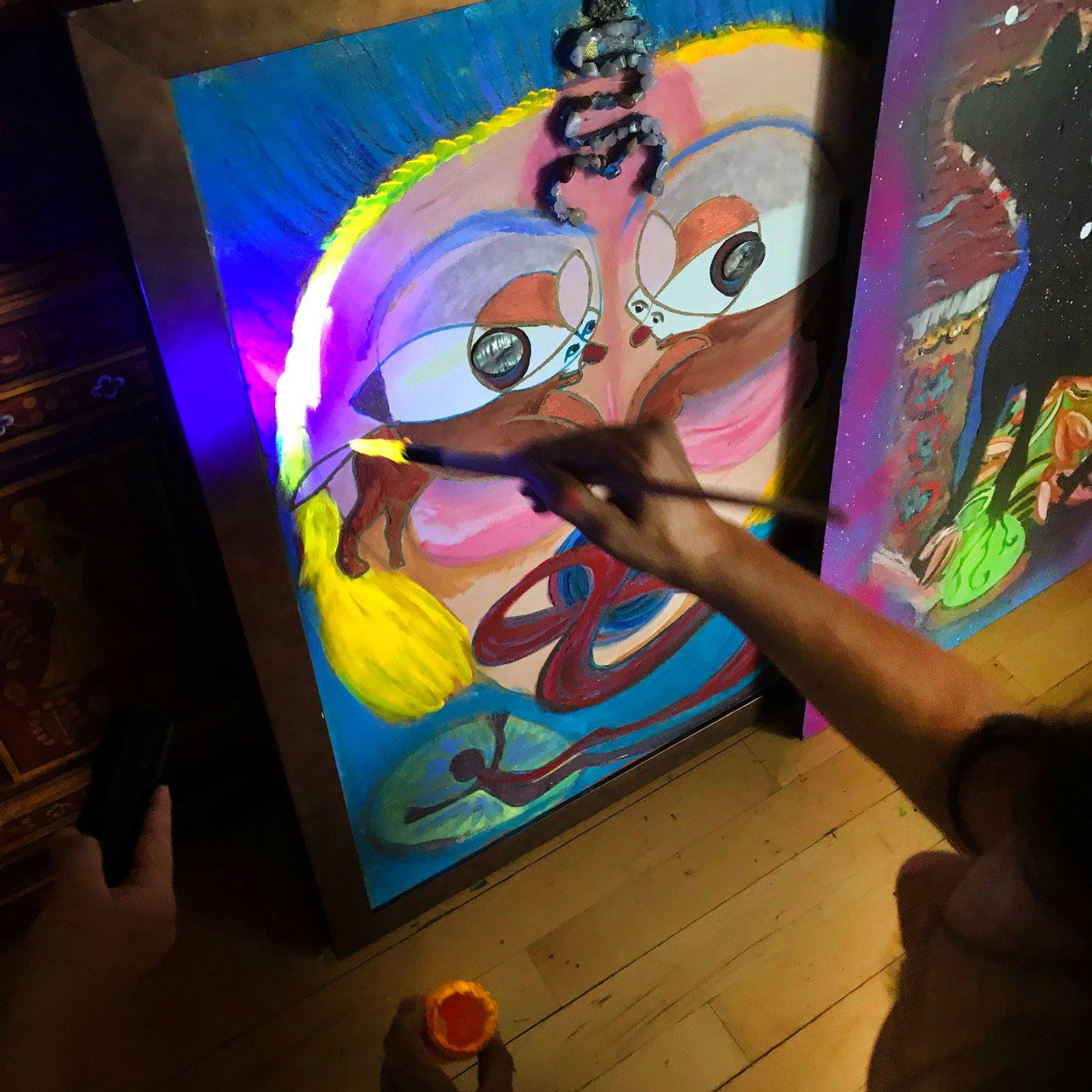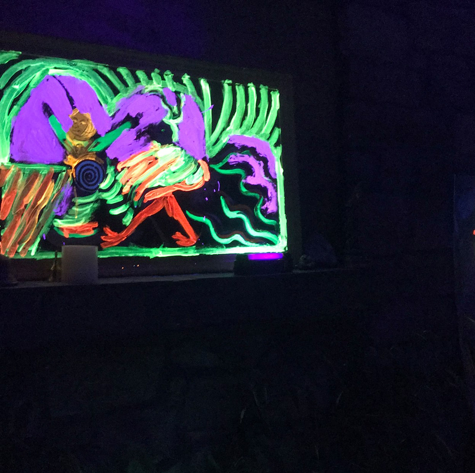 Black Light Gallery Sunwater Spa 2018 Kat has created some truly immersive experiences with her blacklight art including 2018’s Black Light Galler at SunWater Spa in 2018. Black light landscape painting. The Black Light Gallery hanging up at Sunwater Spa during Kat's Aquanox event. Black light Dragon Kite & Mandala painting.