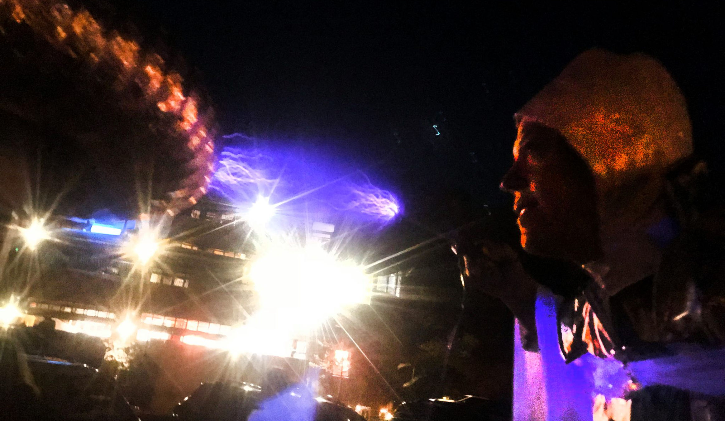 Kat and the Tesla Coil in fron of Sunwater Spa for the Tripping The Light performance.