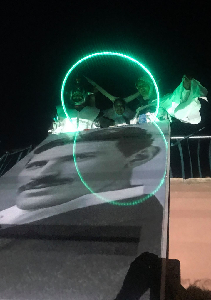 Dancers above the giant picture of Nikola Tesla.