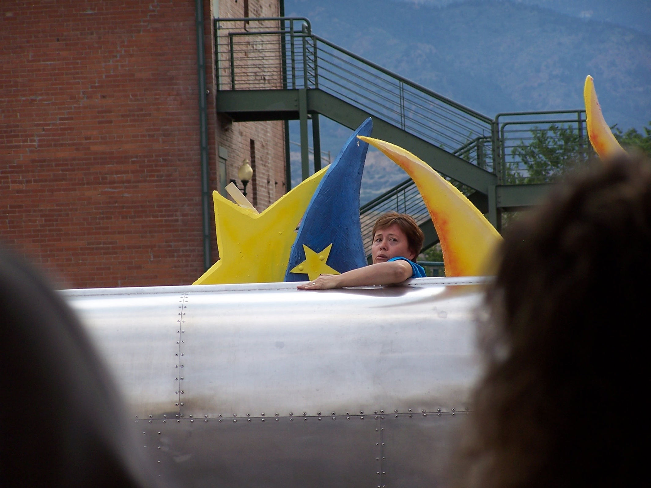 Kat Tudor doing a public performance atop of the Giant Toaster Downtown.