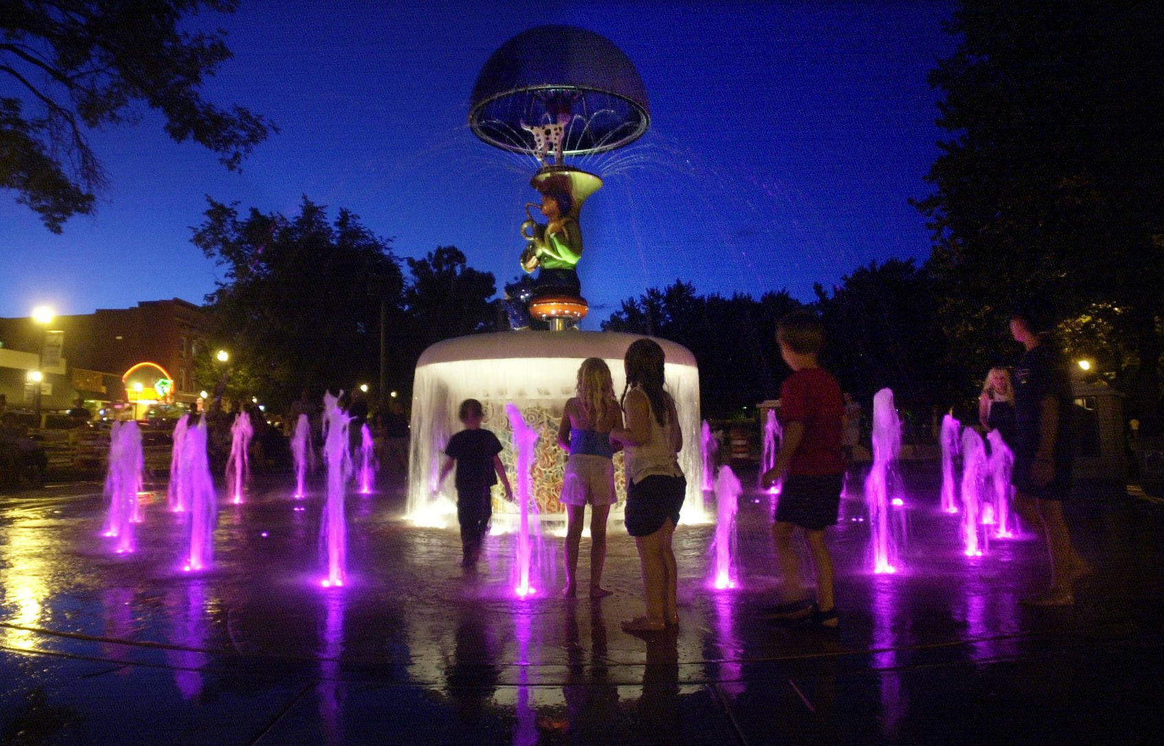 Seemingly a simple blue dome surrounded by water jets, this piece chimes to announce a surprise every quarter hour. The top rises ceremoniously 15 feet into the air to reveal a tuba playing musician and his pet monkey. After performing a short selection of original jazz works composed by Bob Tudor, Wilber slowly descends back into his hiding place at the base of the fountain.